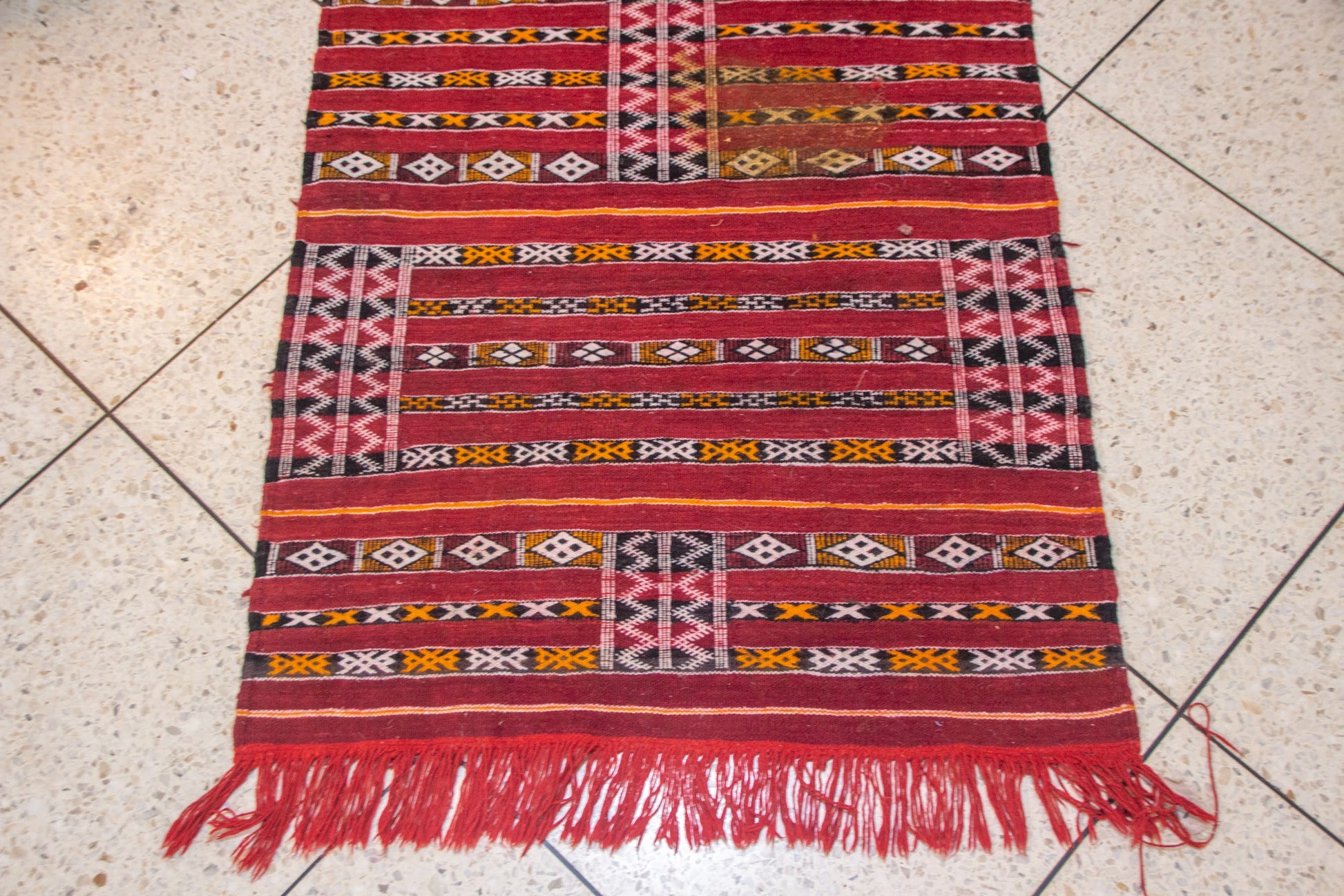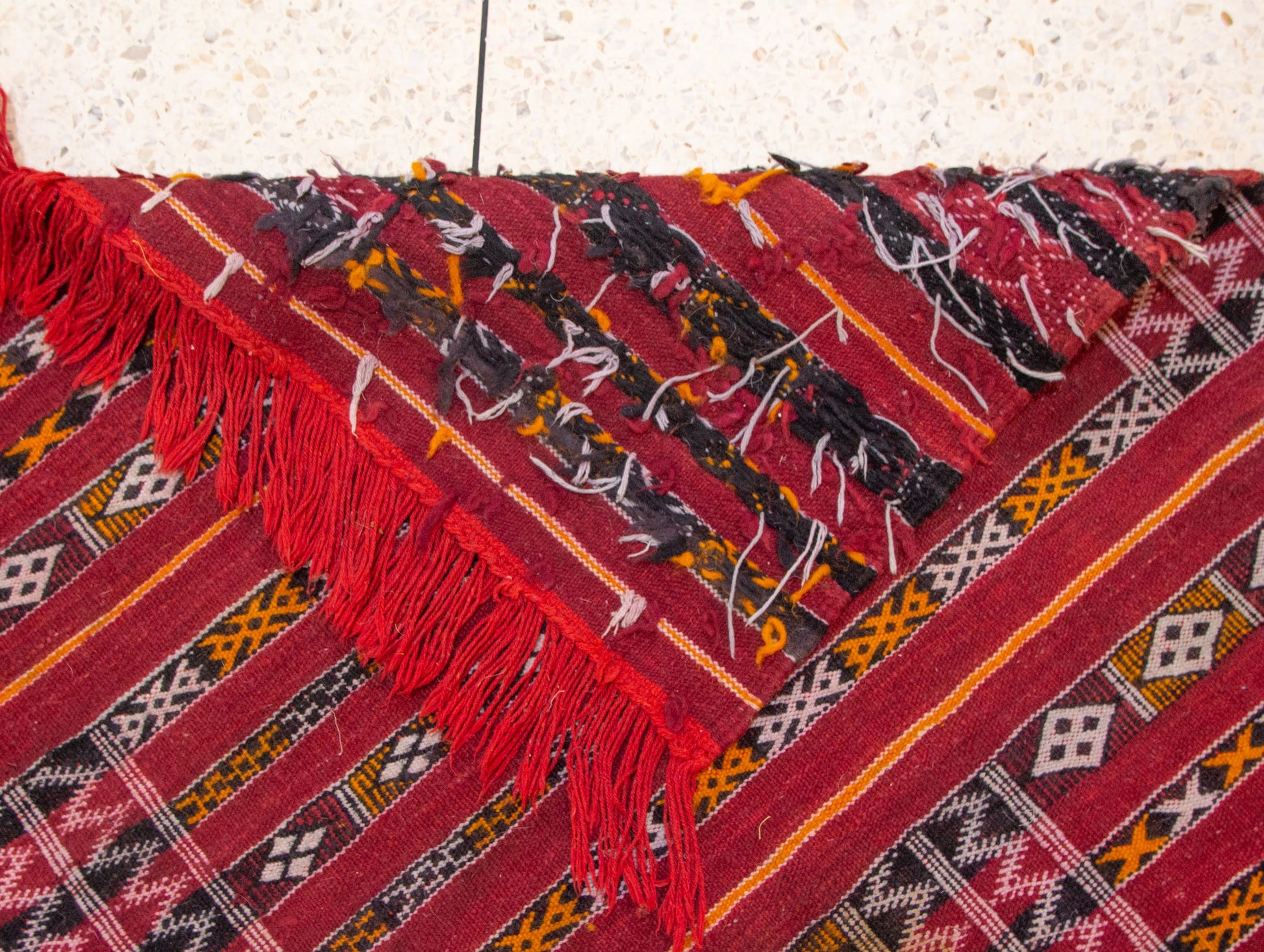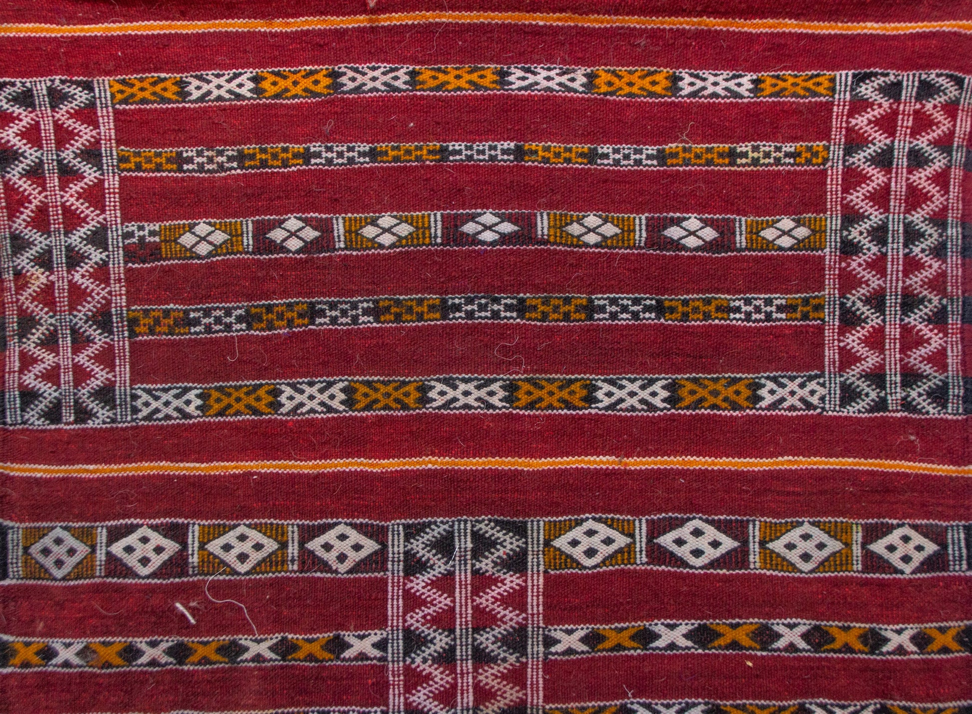 A refined Zemmour hanbel from the Zaer plateau: a deep crimson field articulated by rhythmic procession bands in saffron, plum, and ivory. Brocaded cartouches form latticed portals—ancestral signs of passage, protection, and prosperity—creating an architectural cadence along the runner’s length.