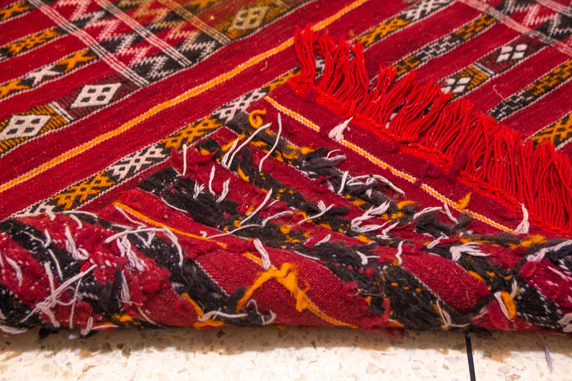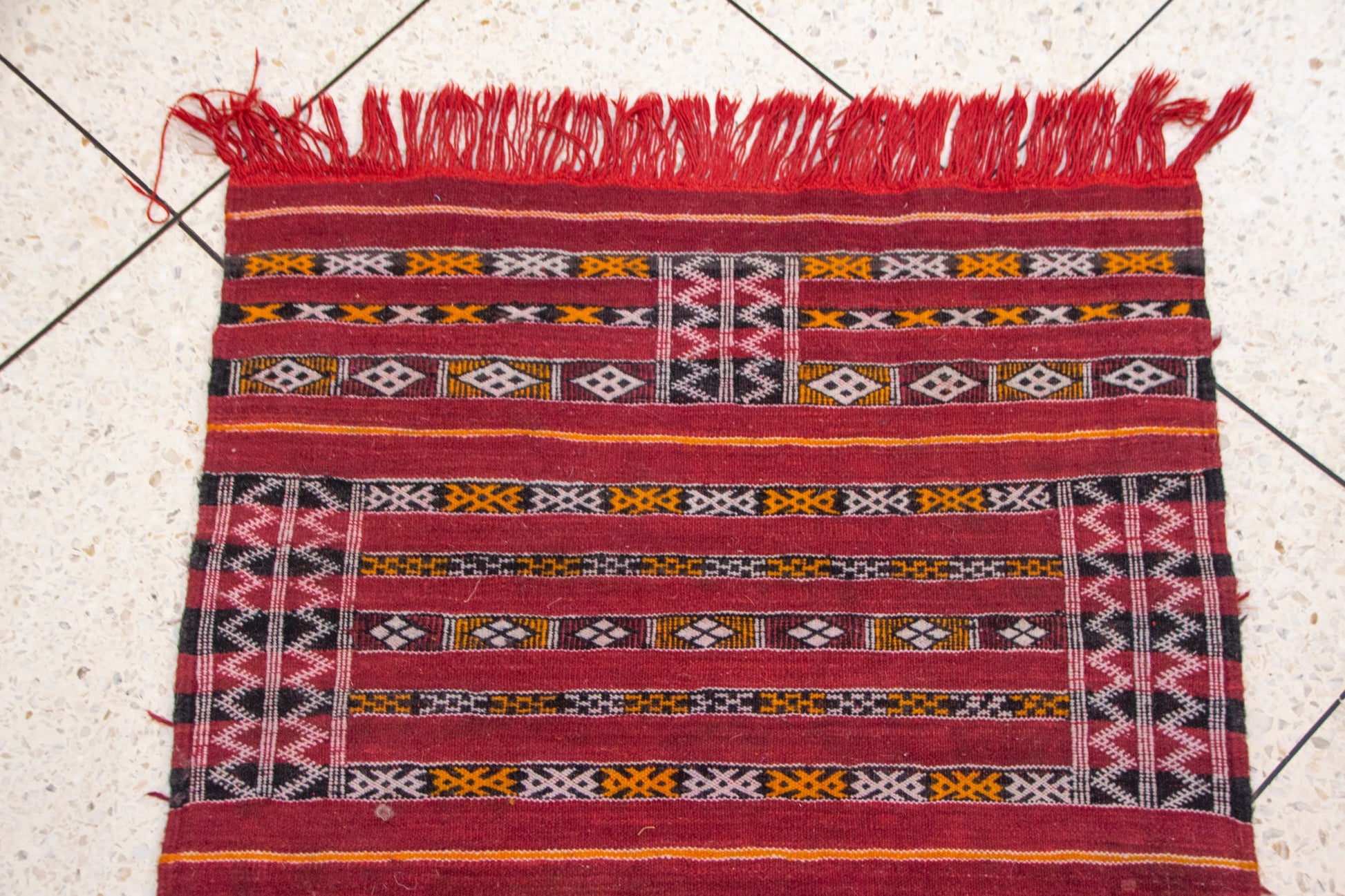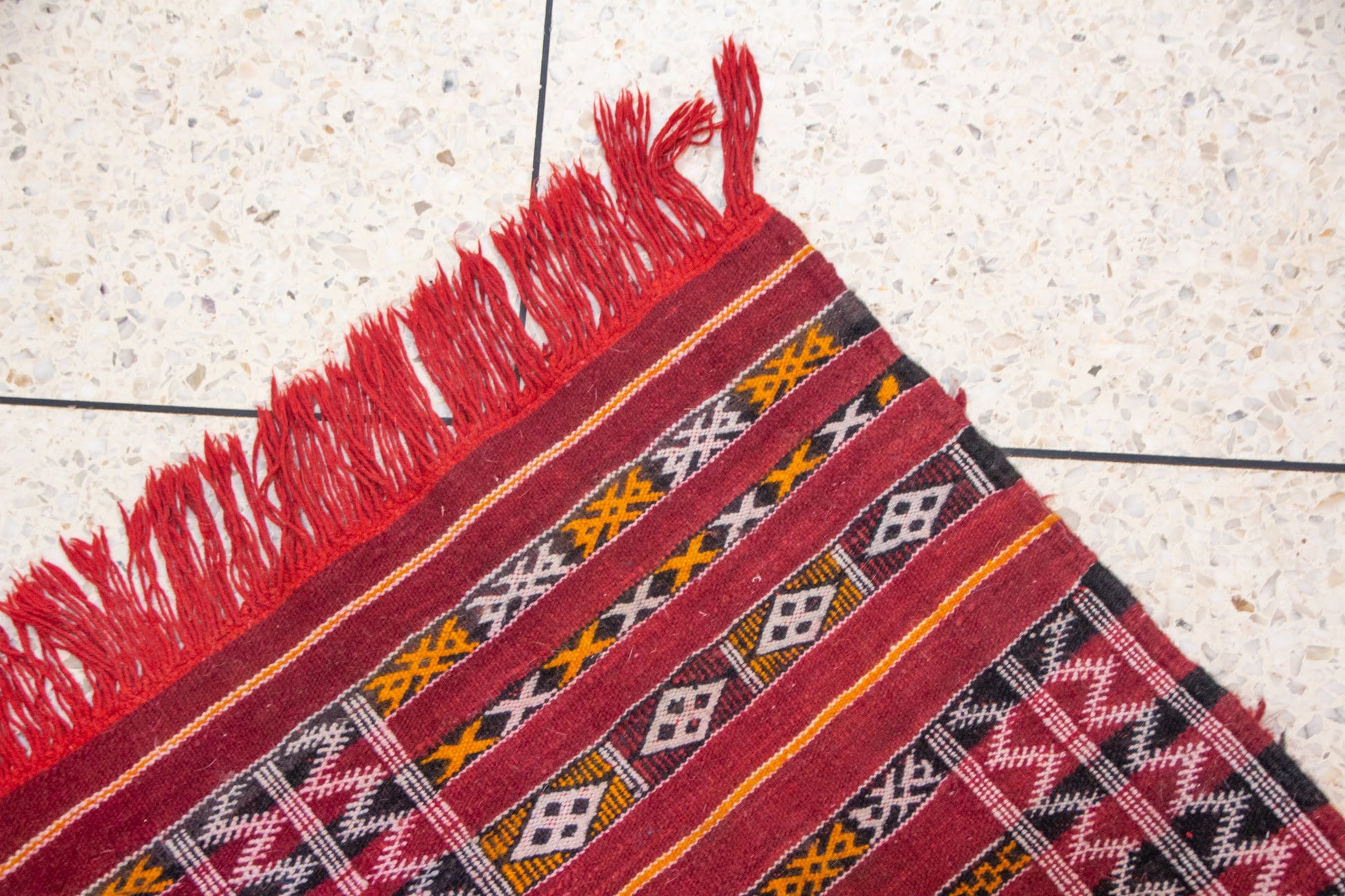A refined Zemmour hanbel from the Zaer plateau: a deep crimson field articulated by rhythmic procession bands in saffron, plum, and ivory. Brocaded cartouches form latticed portals—ancestral signs of passage, protection, and prosperity—creating an architectural cadence along the runner’s length.