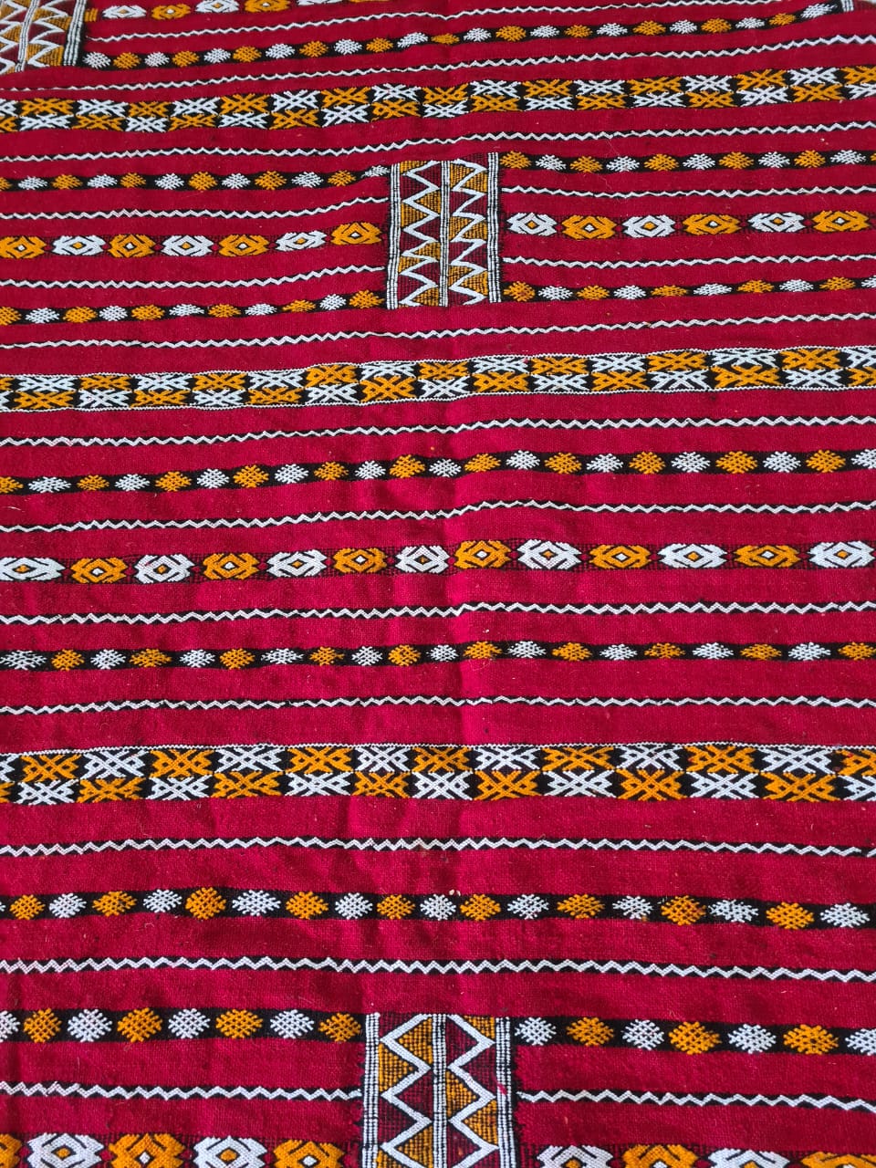 A luminous Zemmour flatweave from the Zaer plateau: rhythmic red ground articulated by caravan bands of saffron and ebony with dotted ivory guard lines. Brocaded cartouches punctuate the field—zigzag spines, seed lozenges, and ladder motifs—encoding protection, passage, and prosperity.