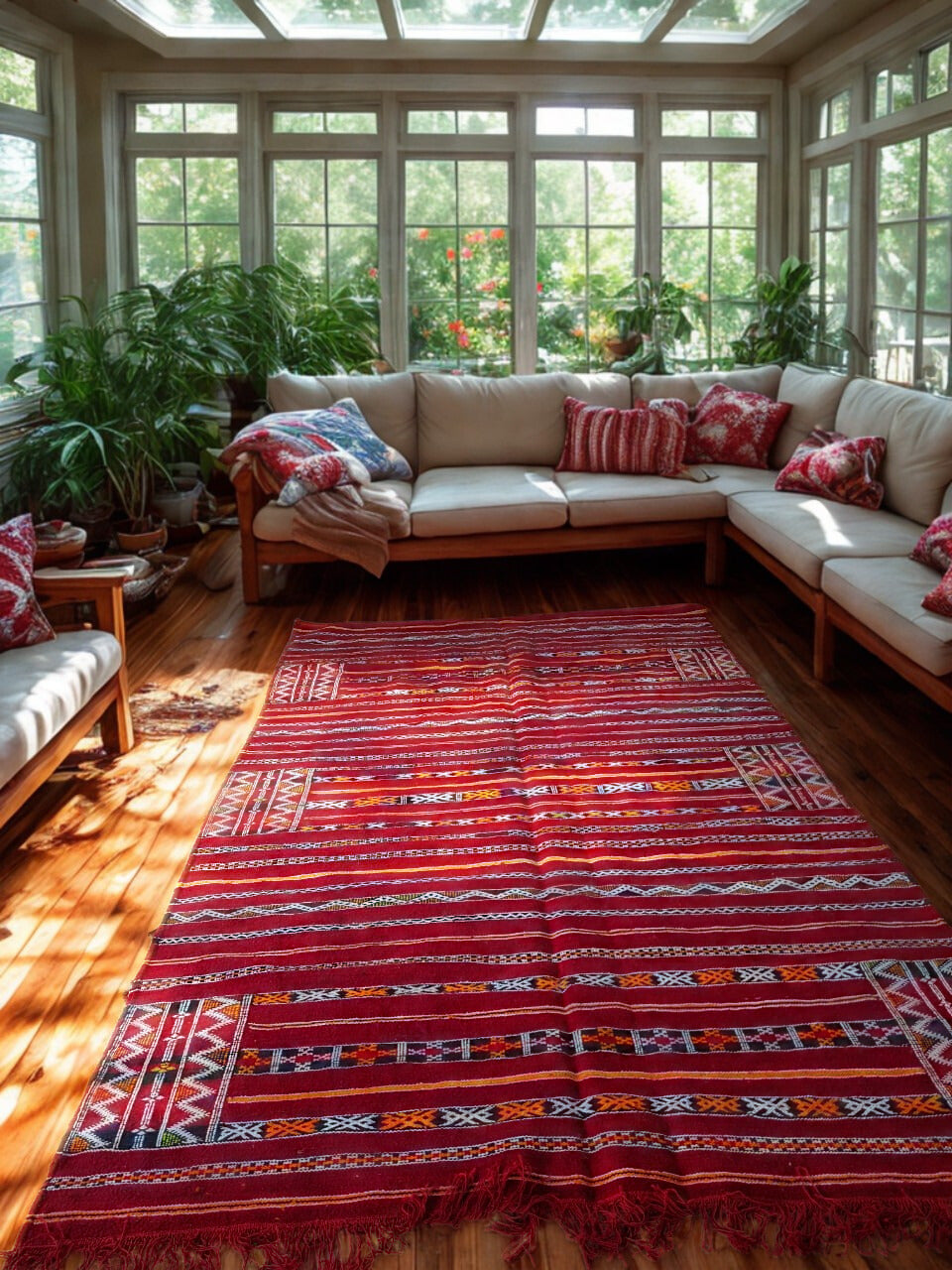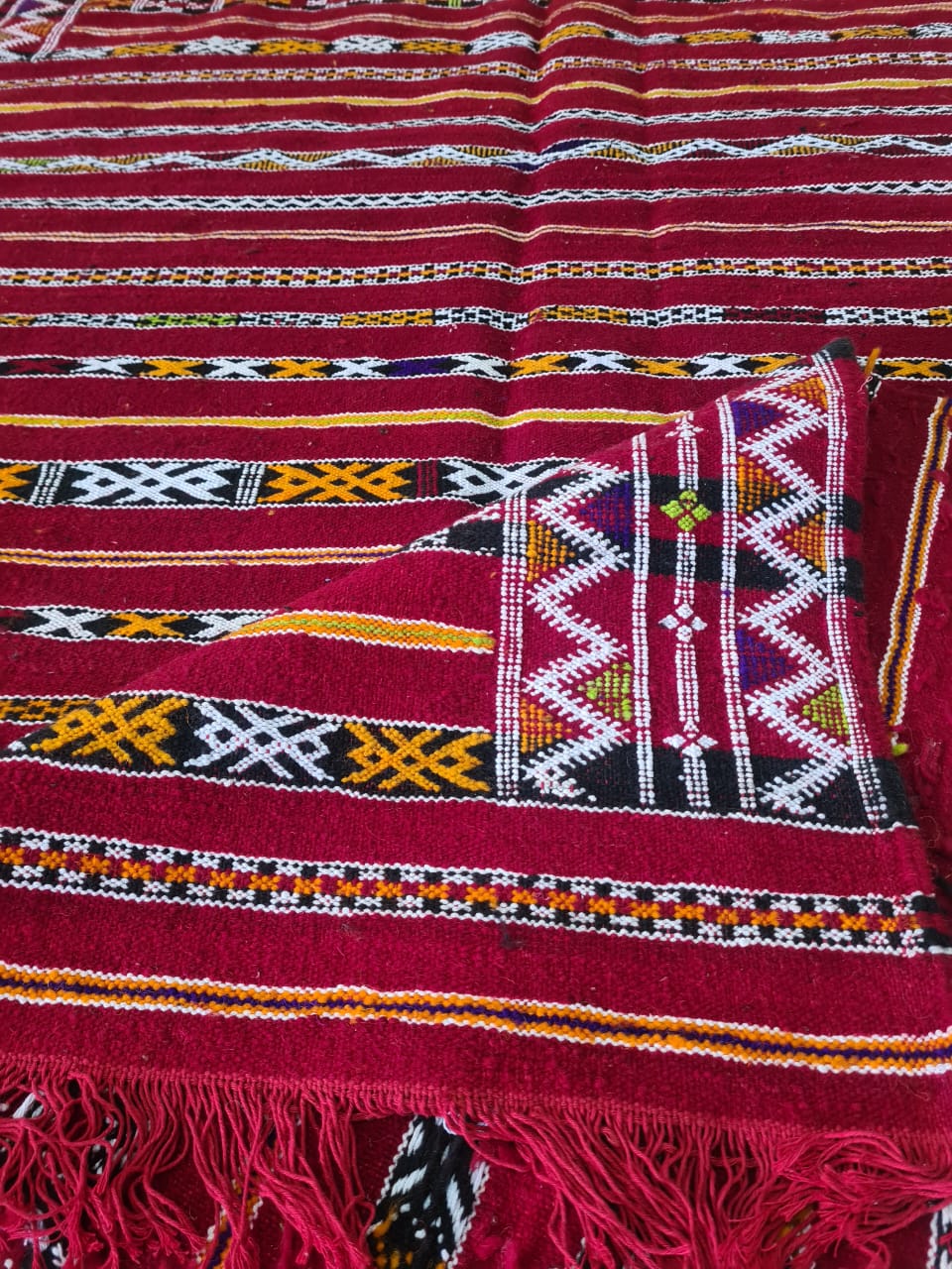 Vivid reds, saffron yellows, and cobalt blues pulse through the piece like a living archive of movement and rhythm. The weft-faced flatweave technique, practiced by Amazigh women across the plateau, creates a surface of remarkable elasticity and softness, ideal for layering in interiors seeking cultural depth.