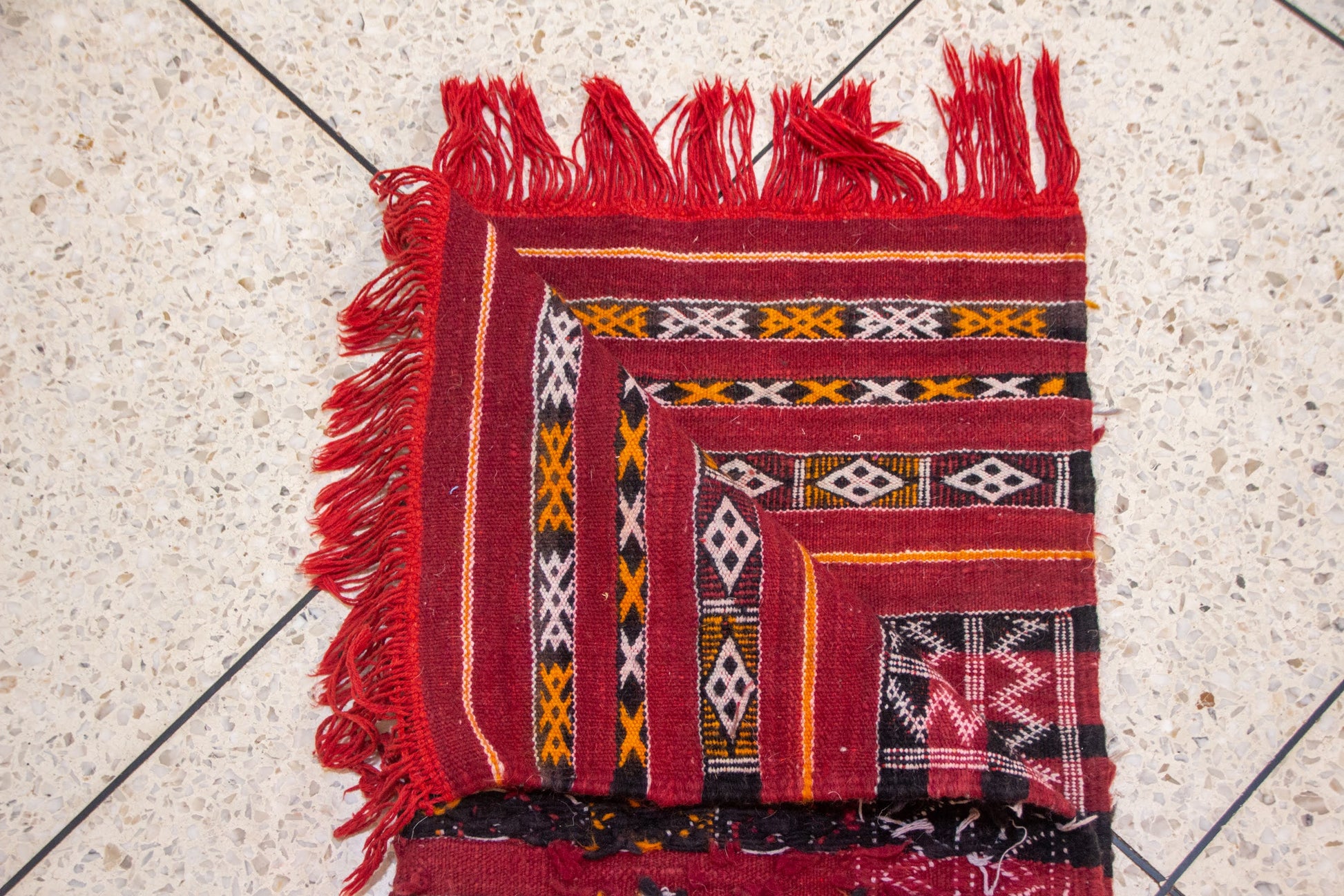 Within its structure, lozenge chains mark continuity, hooked forms guard thresholds, and horizontal registers hold the rhythm of ancestral craft. Every knot and weft is an invocation of Zemmour identity: precise, protective, enduring.