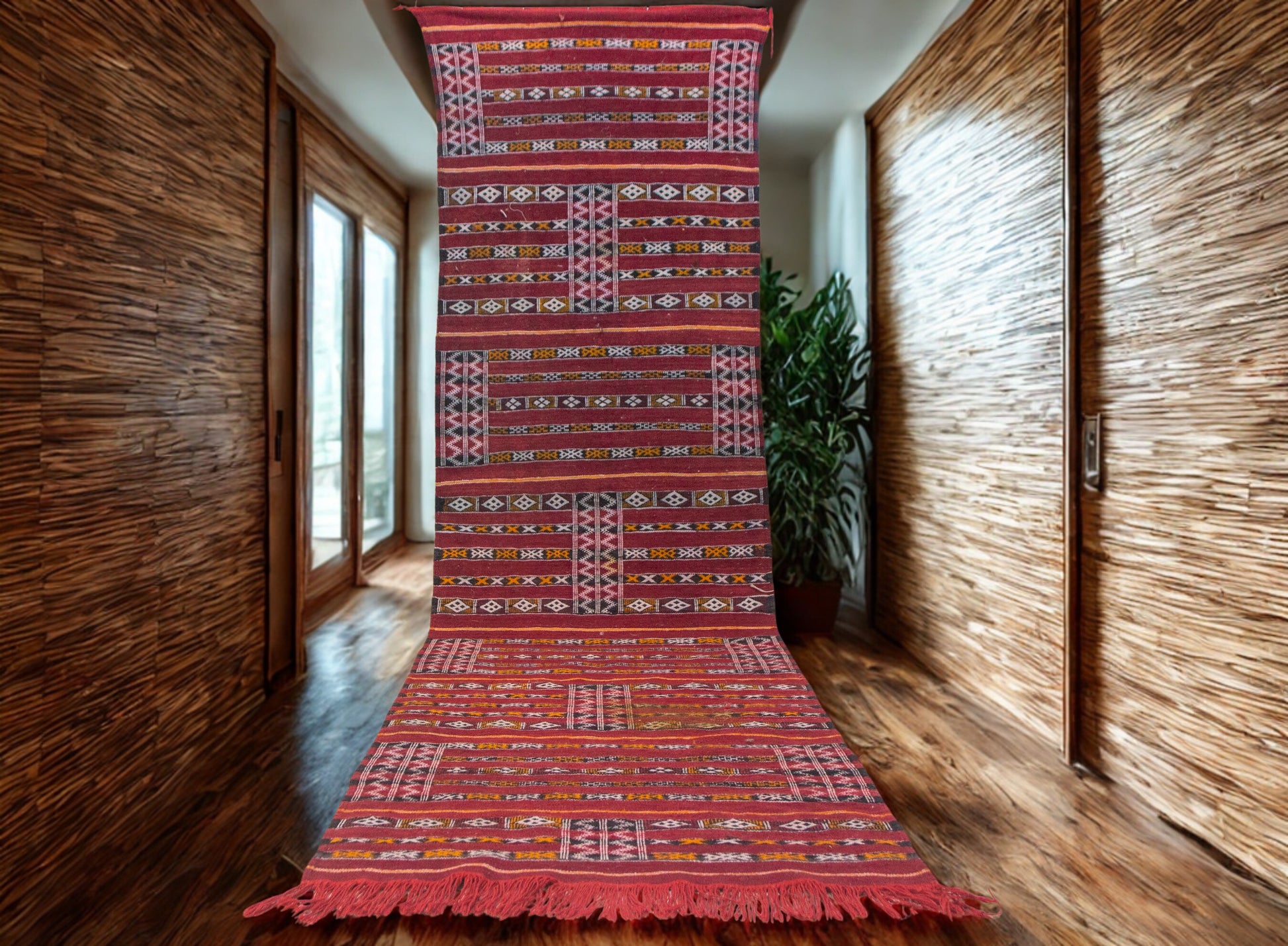 This Zemmour runner is a woven archive of the Middle Atlas: a crimson ground enriched with ritual geometry, each band narrating lineage and protection. Designed to accompany narrow spaces—hallways, vestibules, layered interiors—its composition transforms function into ceremony.