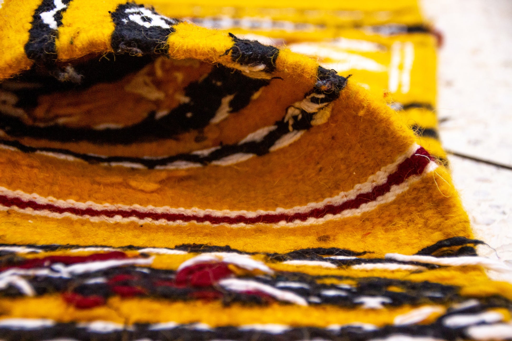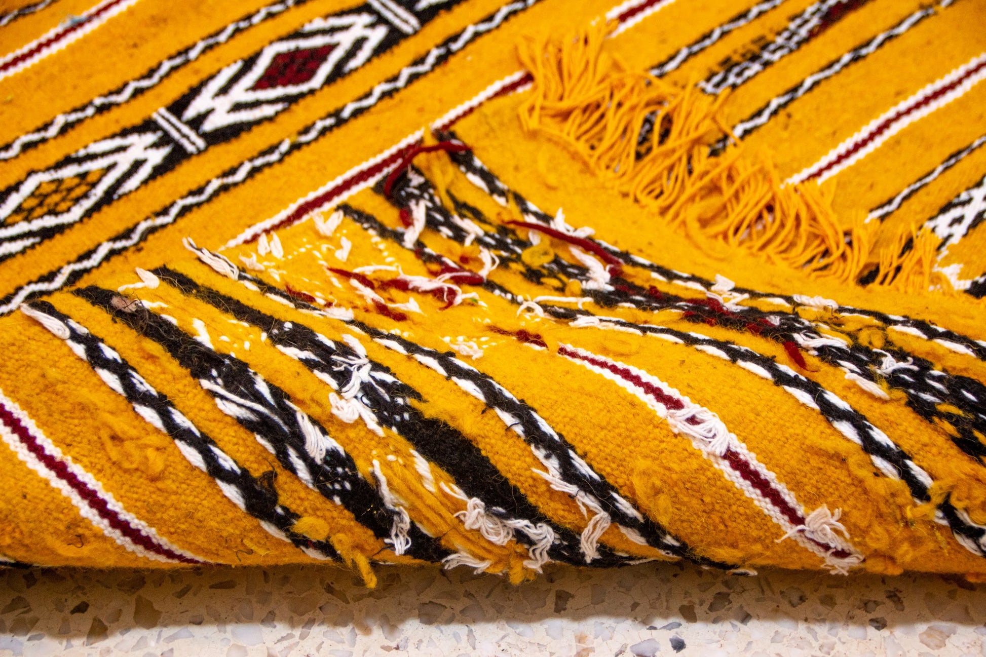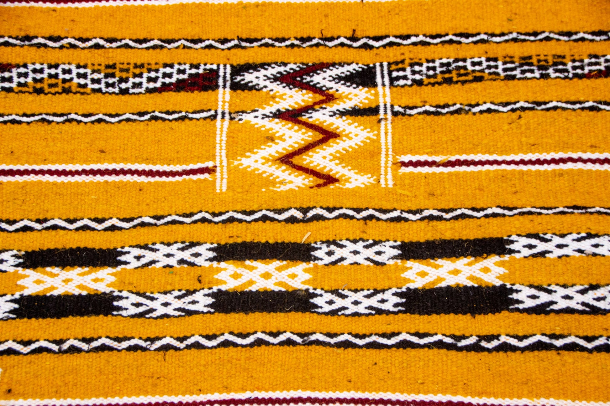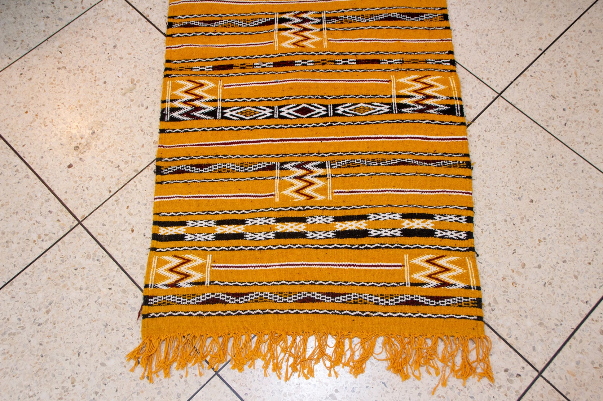 From the heart of the Zemmour plateau, this handwoven wool runner embodies the ancestral codes of Morocco's weaving heritage. Designed for corridors, entrances, or layered interiors, its vivid amber yellow field is balanced with geometric bands and protective glyphs—woven as both art and talisman.