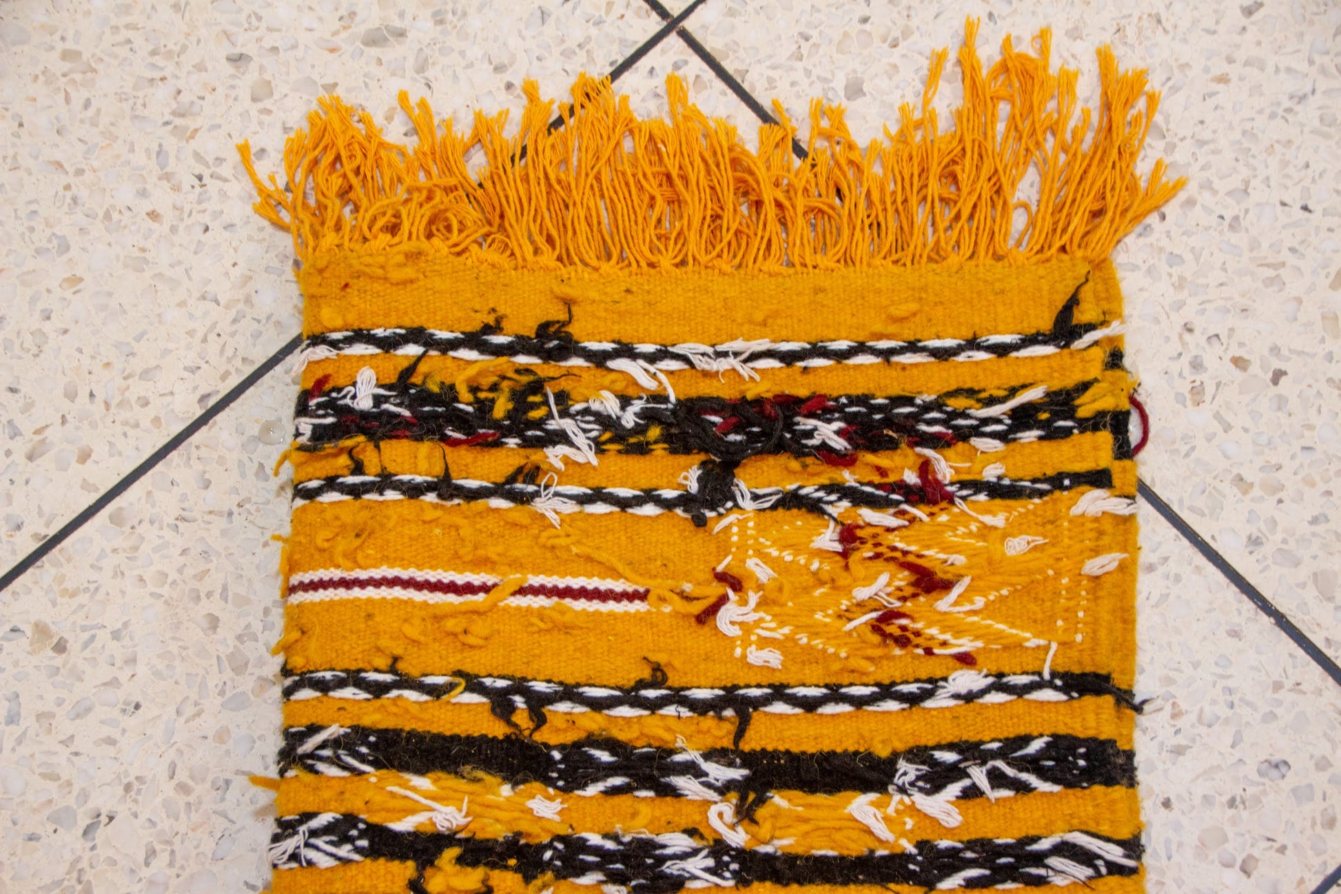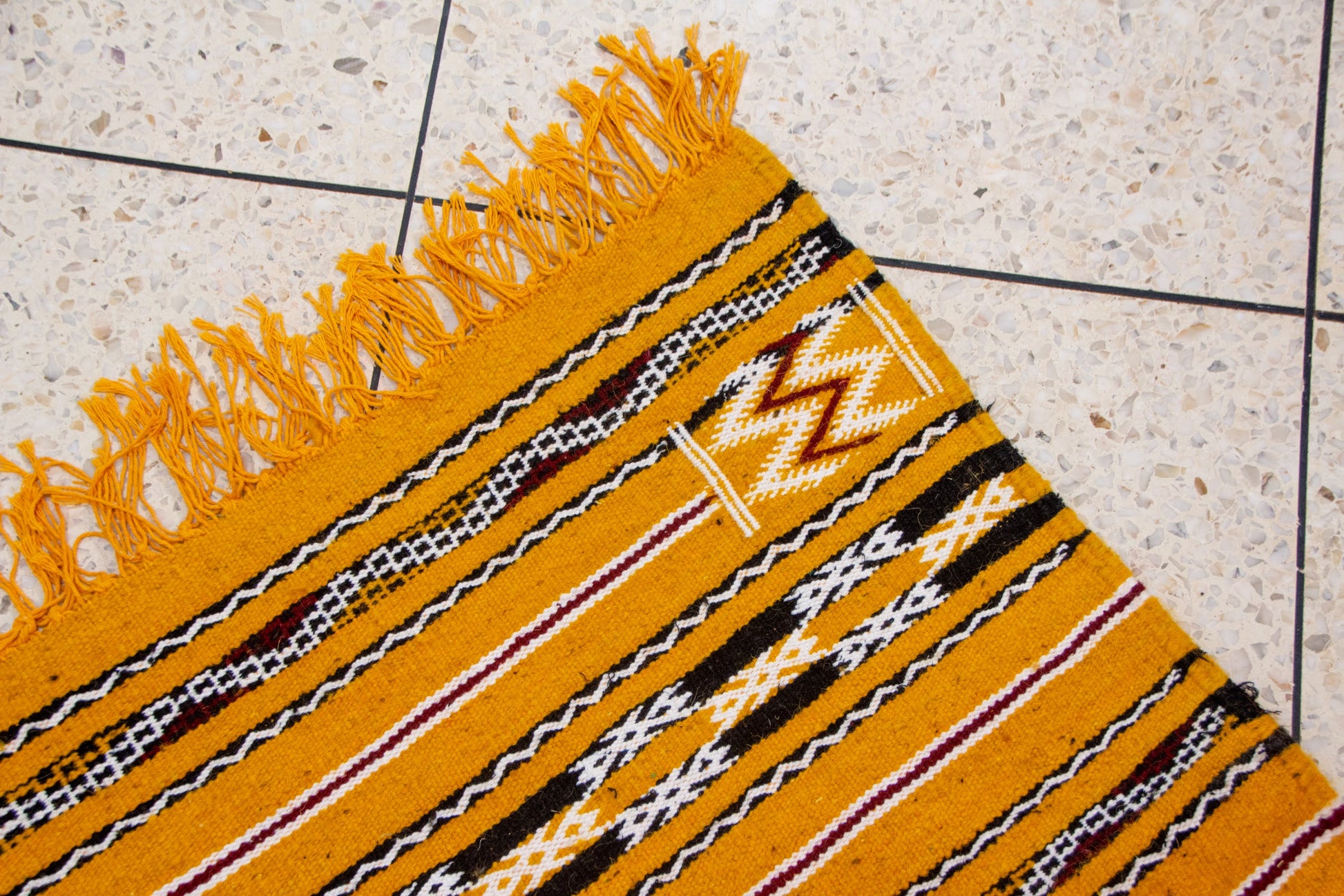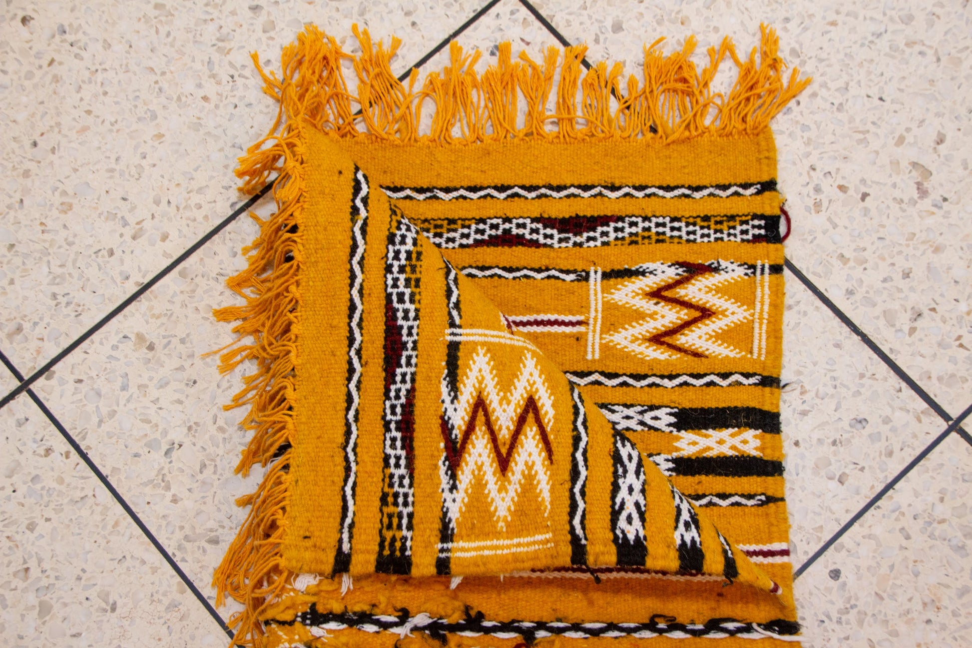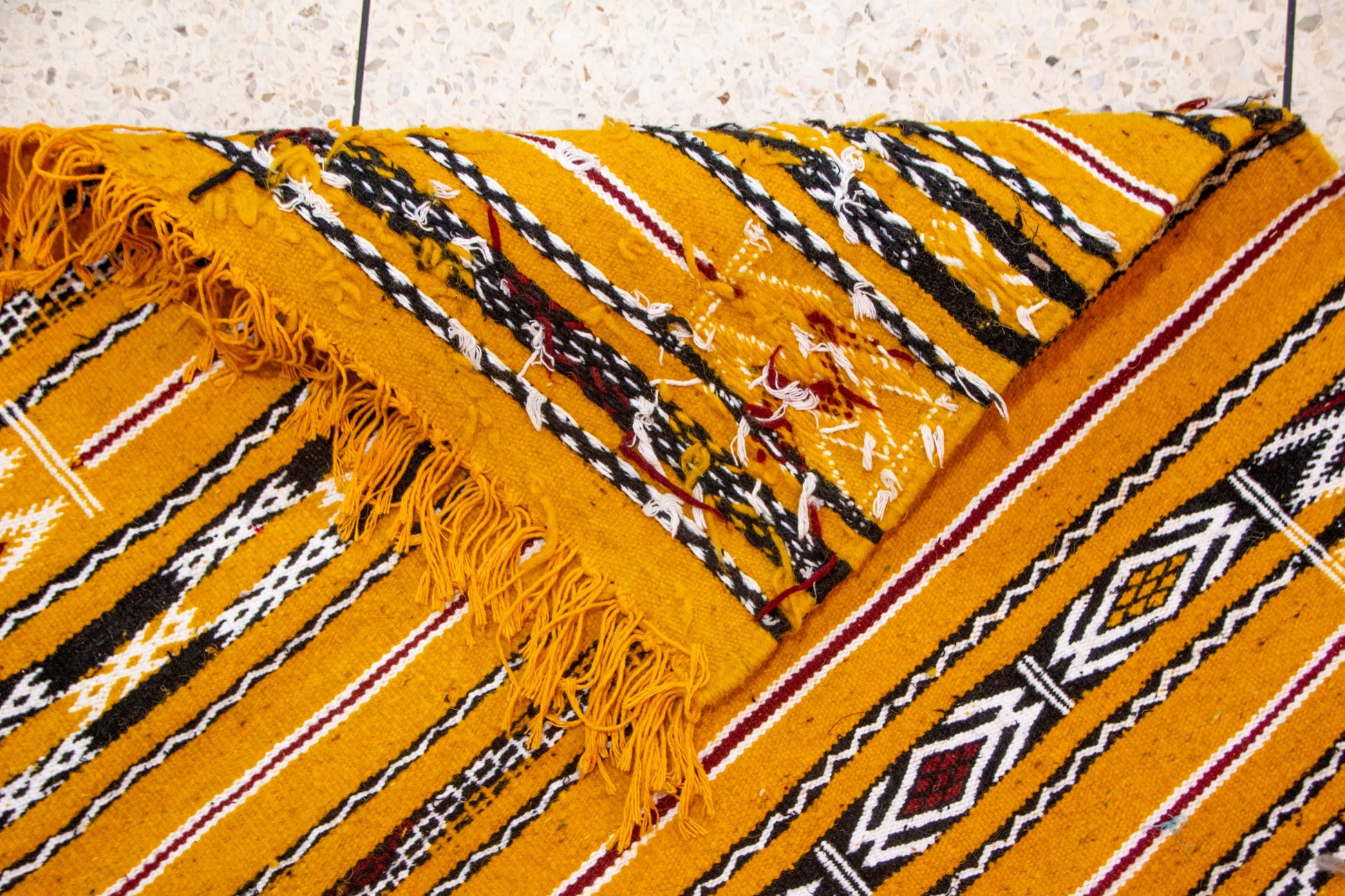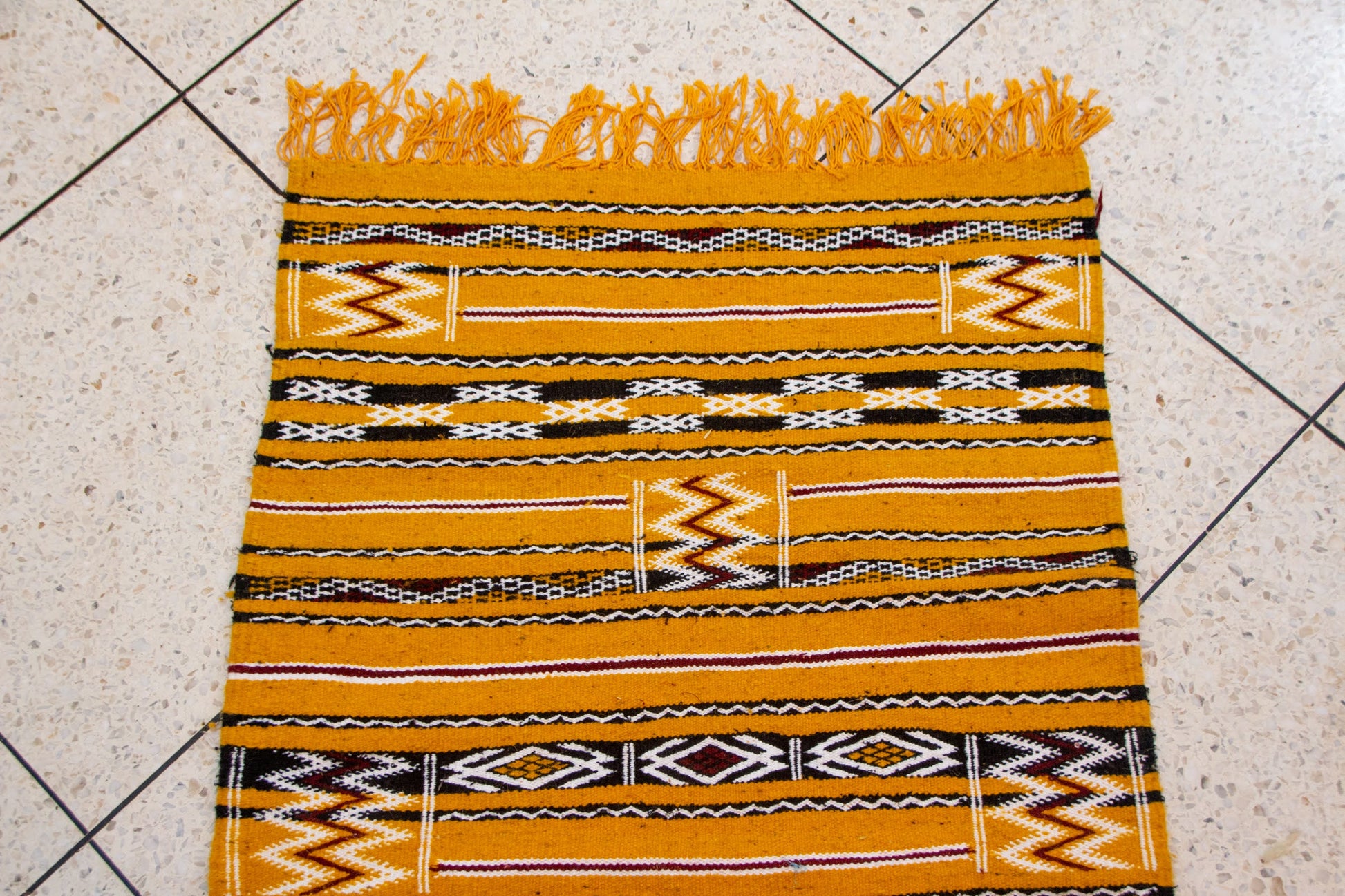 From the heart of the Zemmour plateau, this handwoven wool runner embodies the ancestral codes of Morocco's weaving heritage. Designed for corridors, entrances, or layered interiors, its vivid amber yellow field is balanced with geometric bands and protective glyphs—woven as both art and talisman.